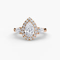 A unique take on the classic three-stone ring, this design is enhanced with a radiant halo for amplified brilliance and symbolism. Timeless with a modern twist.