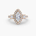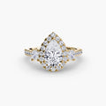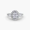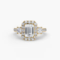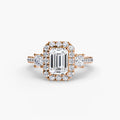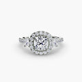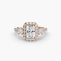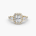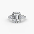 A unique take on the classic three-stone ring, this design is enhanced with a radiant halo for amplified brilliance and symbolism. Timeless with a modern twist.